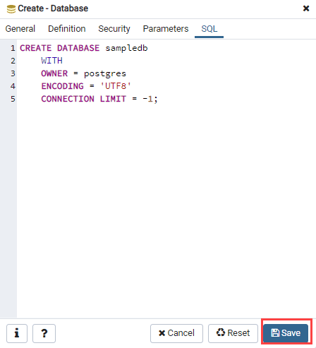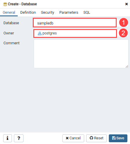 In the Definition tab, you can select the encoding, a template, tablespace, collation, character type, and connection limit.