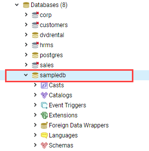 Finally, click the Save button to create the sampledb database. You will see the sampledb listed on the database list: